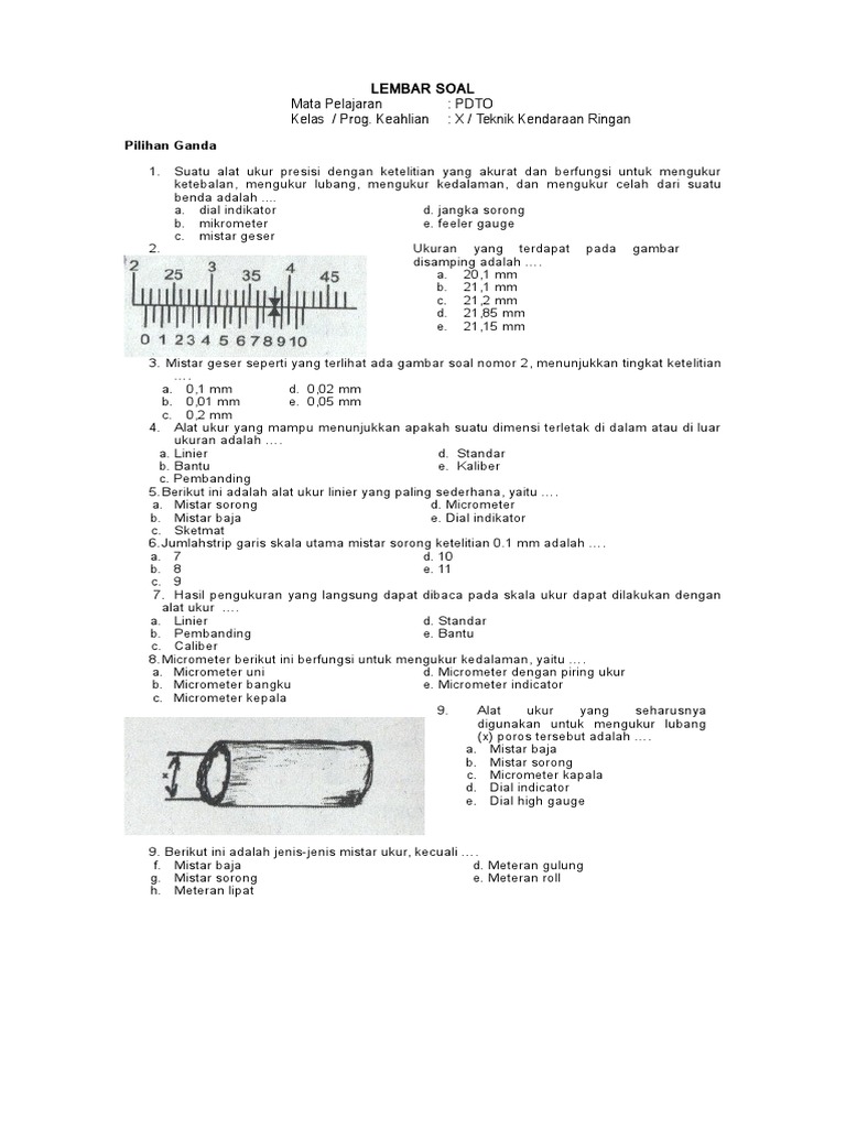 Lembar Soal Mata Pelajaran Pdto Kelas Prog Keahlian X Teknik Kendaraan Ringan
