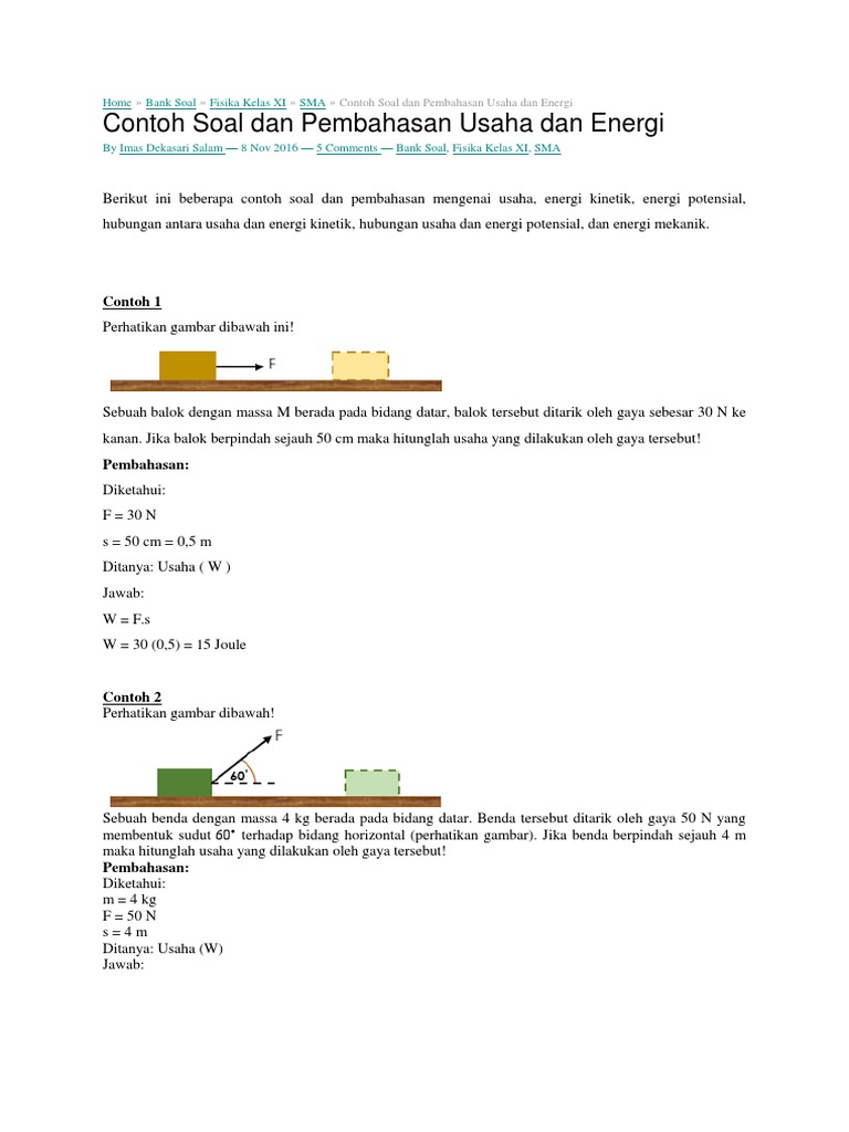 Blog tentang Guru dan Pendidikan Indonesia berisi Aplikasi Pendidikan Perangkat Administrasi Sekolah Perangkat Pembelajaran. Mirna Sari Sinaga NISN. Contoh Soal Usaha dan Energi dan Kunci Jawaban beserta Pembahasan Usaha merupakan besarnya energi untuk merubah posisi yang diberikan gaya pada benda atau objek.