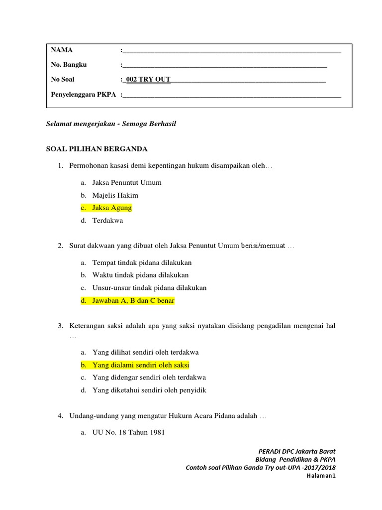Latihan soal ujian profesi advokat hukum acara pidana 2 2 komentar di latihan soal ujian profesi advokat hukum acara pidana buana bayu desember 22 2014 pukul 148 pm thanks infonya bro. Dengan pembagian bobot nilai 70 untuk pilihan ganda dari 120 soal maka nilai persoal yang dijawab benar 70. 1 Mahkamah Agung menangani beberapa bidang kasasi dan memutuskan perkara dalam tingkat terakhir.