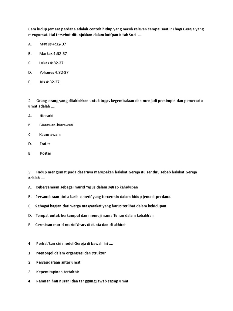 Pilihlah salah satu alternatif jawaban benar. 41 - 47 41 Orang-orang yang menerima perkataannya itu memberi diri dibaptis dan pada hari itu jumlah mereka bertambah kira-kira tiga ribu jiwa. Soal penilaian akhir semester 3 pendidikan agama katolik kelas 11 ini berisi 50 butir soal yakni 45 nomor soal pilihan ganda dan 5 nomor soal uraian Contoh perangkat mengajar K13 Terbaru dan lengkap Agama Katolik.
